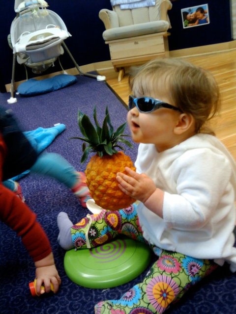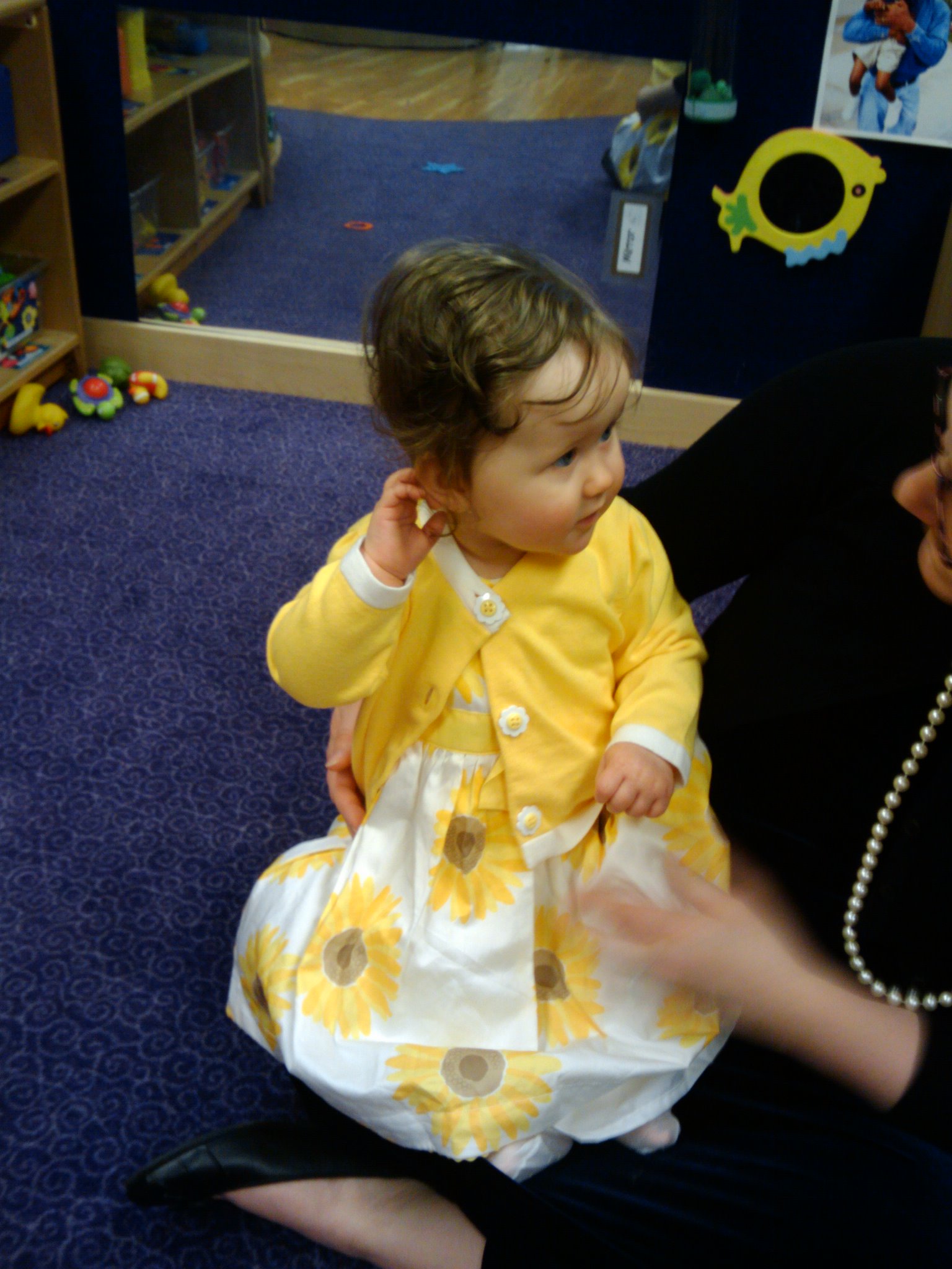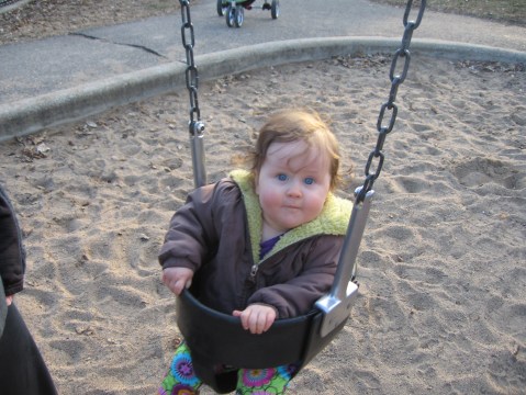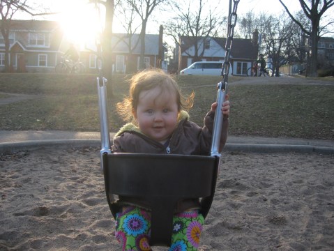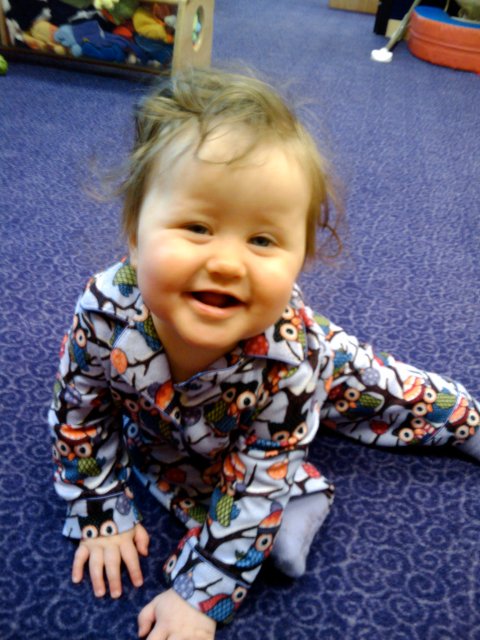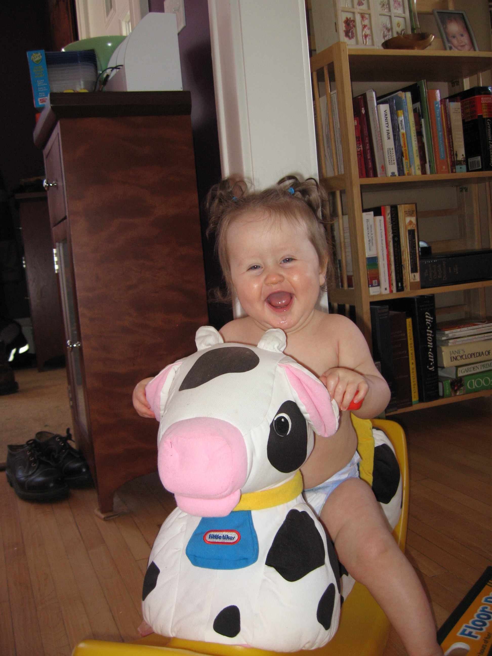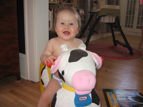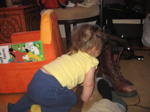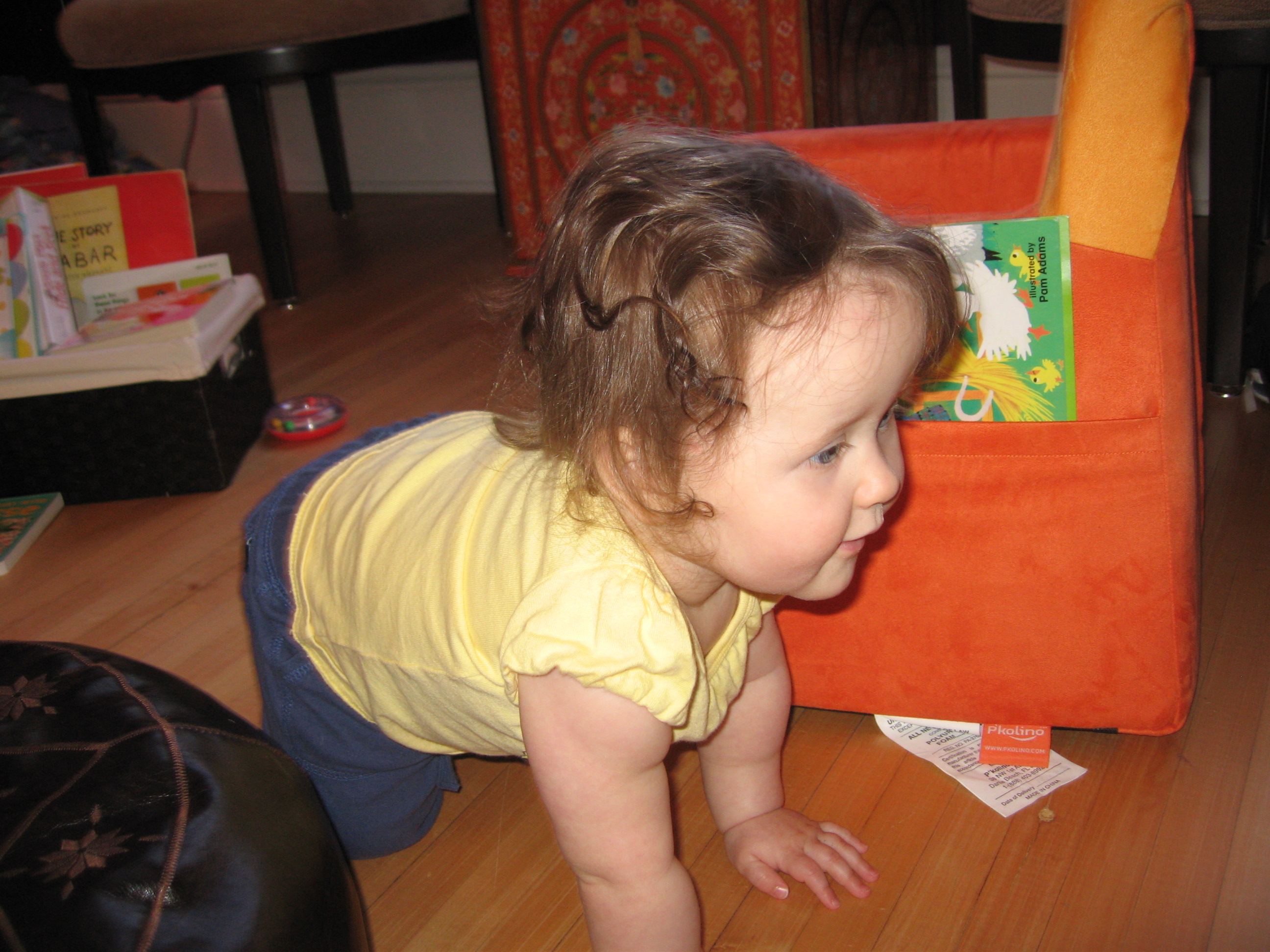 Evelyn’s big new trick is crawling. She’s gone from not-quite-there to all over it in about the last week. She is now a very confident crawler, able to zip over hardwood floors and negotiate various assorted obstacles in order to get at whatever captures her interest.