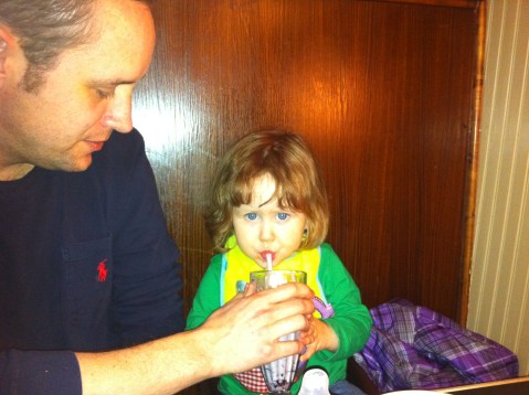 We told her she didn’t have to drink it all at once and that she could take a rest if she wanted to.  That just resulted in her leaning her head against Dad’s shoulder, continuing to suck vigorously on the straw.