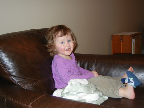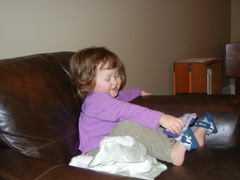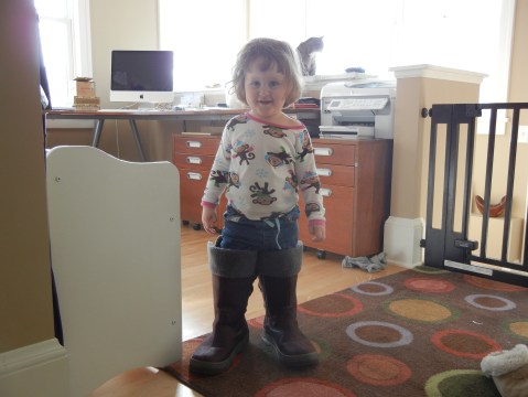 This weekend, Evelyn went to a party for her mom’s work.  There were lots of other kids there, loads of toys, and plenty of space to run in.  But for whatever reason, this is how Evelyn decided to entertain herself.