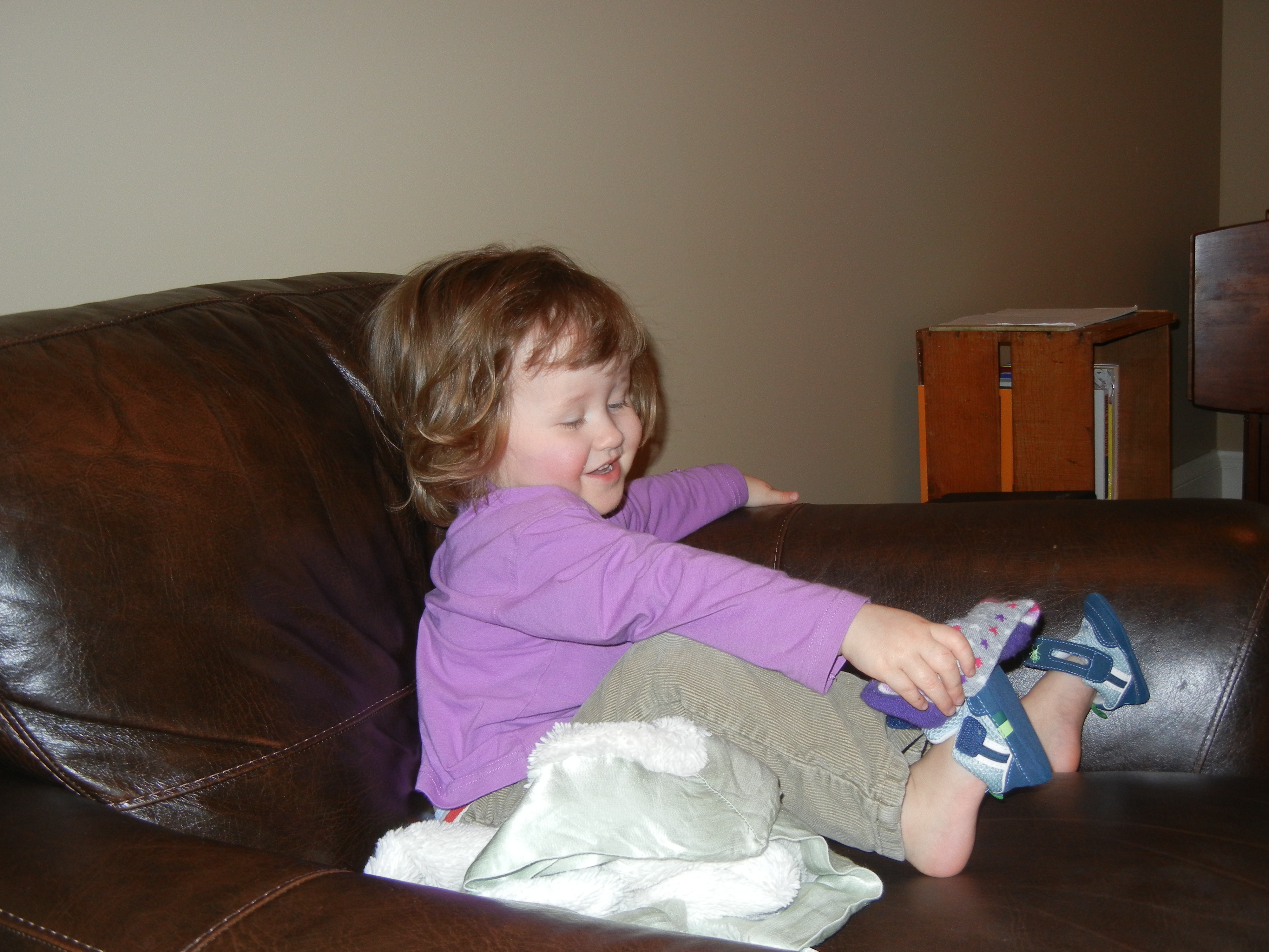 After the fun of trying on Mama’s boots, Evelyn decided to go the other direction and see if she could fit into some baby shoes. The baby’s shoes are officially “tiny.”