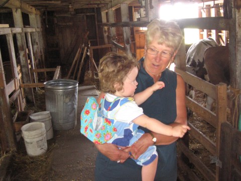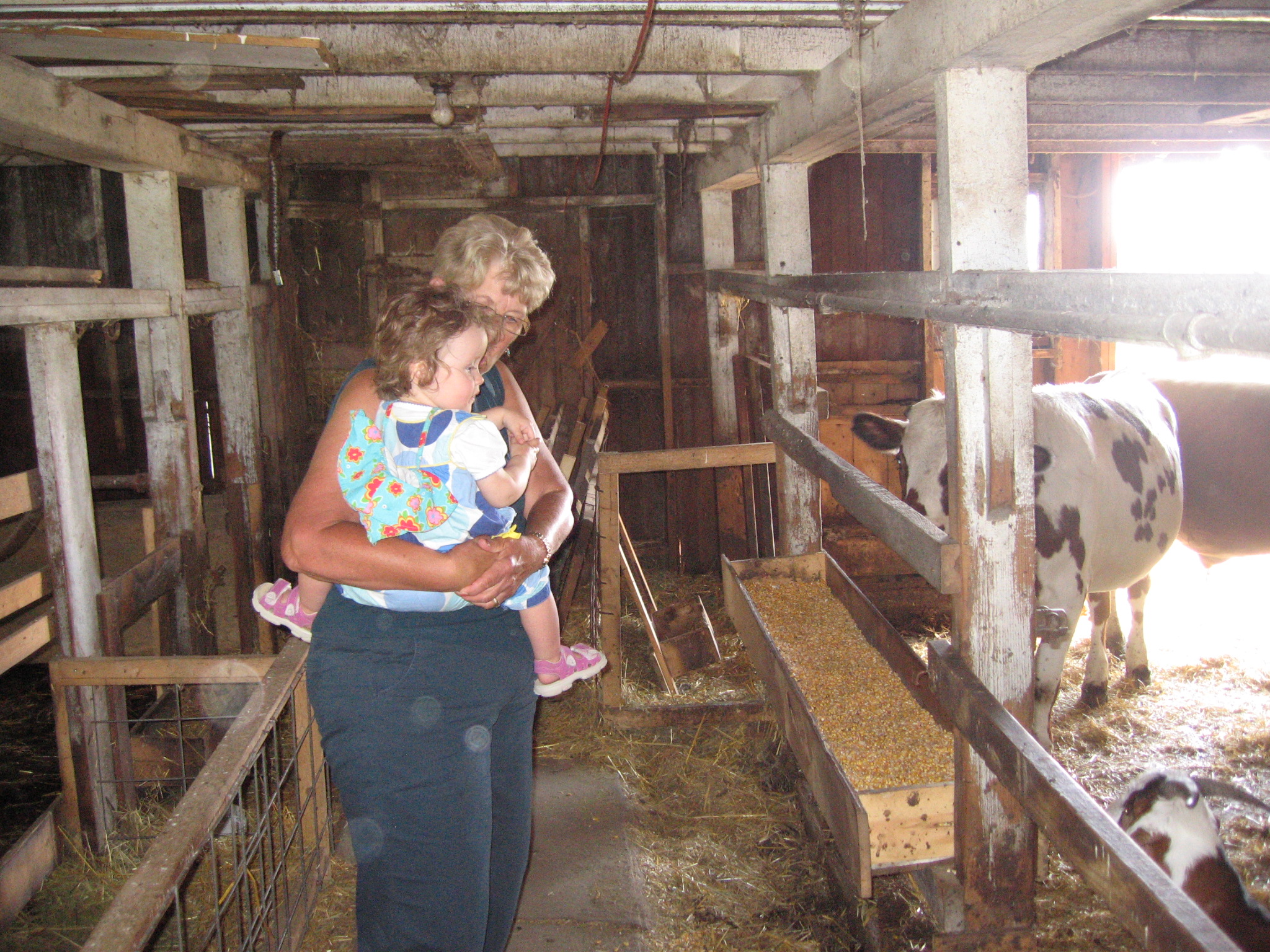 On Sunday, Evelyn went to a family reunion out on her great-aunt and -uncle’s farm. It was lots of fun to see all the family, and to meet a lot of people she hadn’t met before. Grandma came, and took Evelyn into the barn to meet some of the animals. Evelyn met the cows, a goat, and the donkeys.